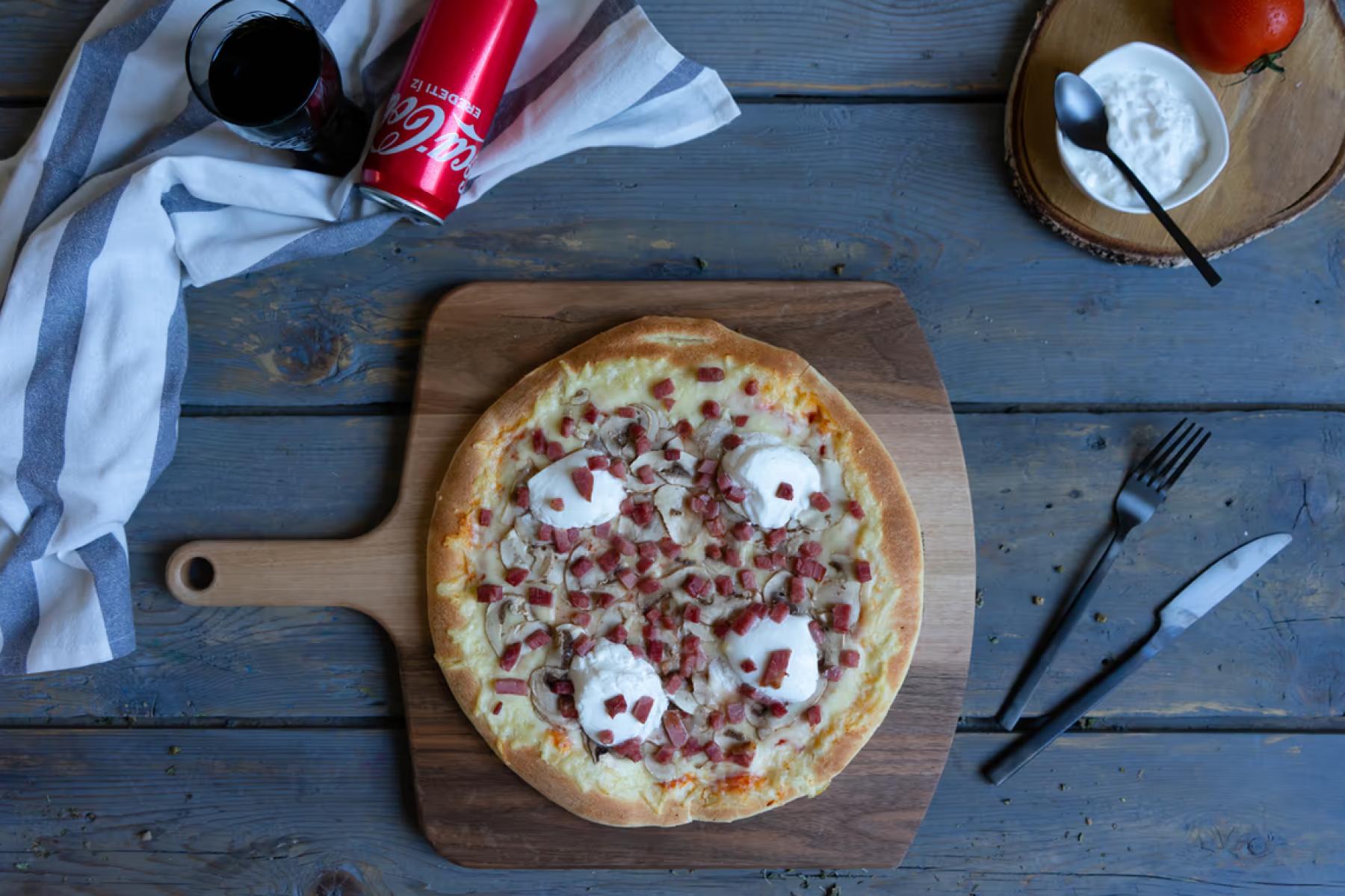 • Duna Paradicsomszósz, sajt, sonka, tojás, császárszalonna, hagyma, kolbászGluténTejTojás