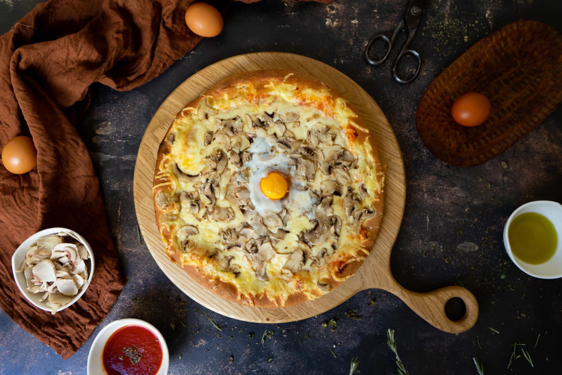• Bismark Paradicsomszósz, sajt, sonka, gomba, tojásGluténTejTojás