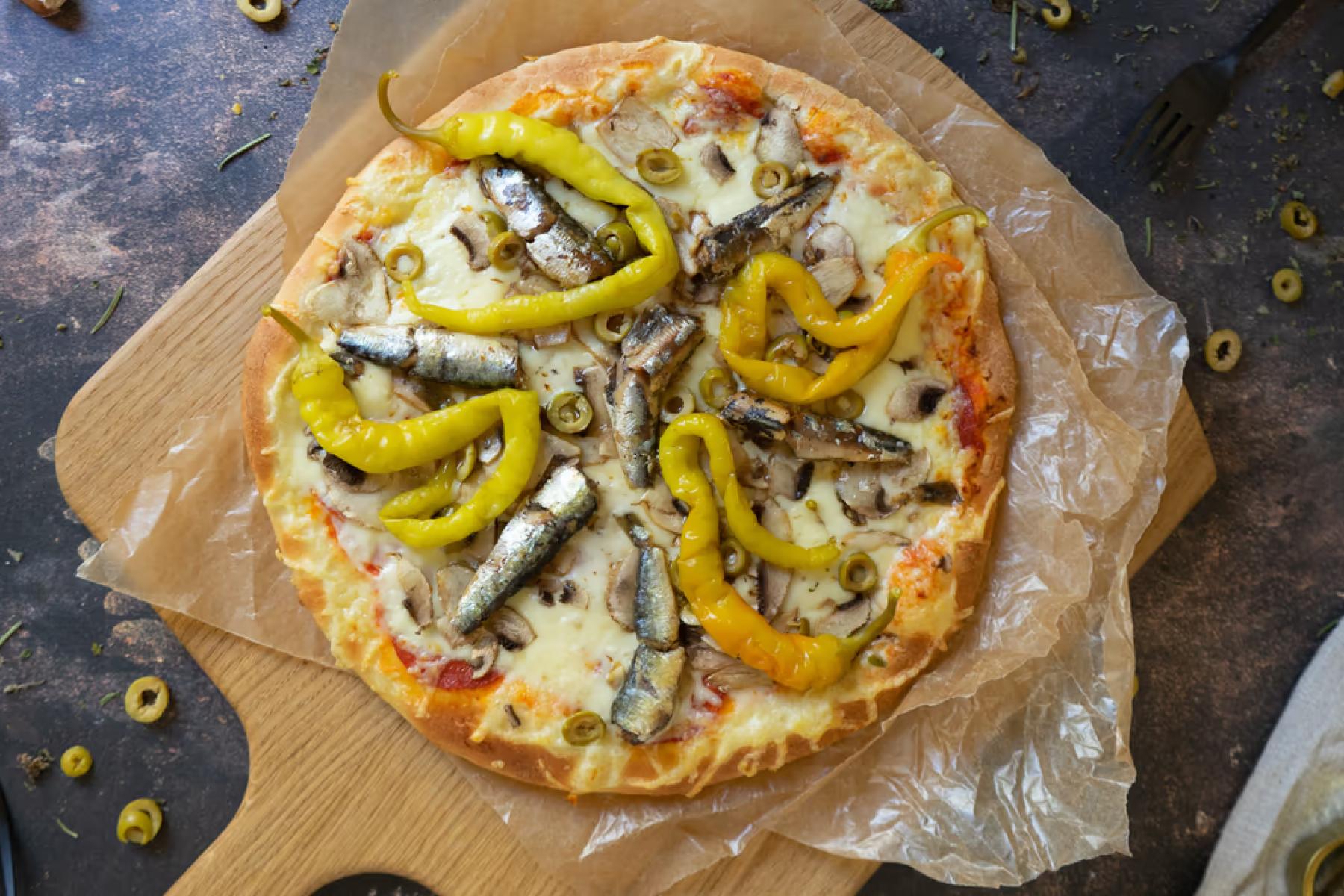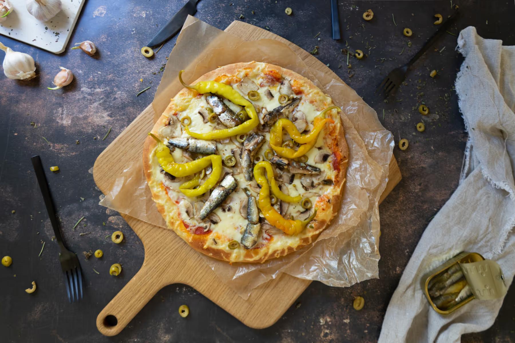 • Siciliana Paradicsomszósz, sajt, hagyma, szardínia, olivabogyóGluténTejHal