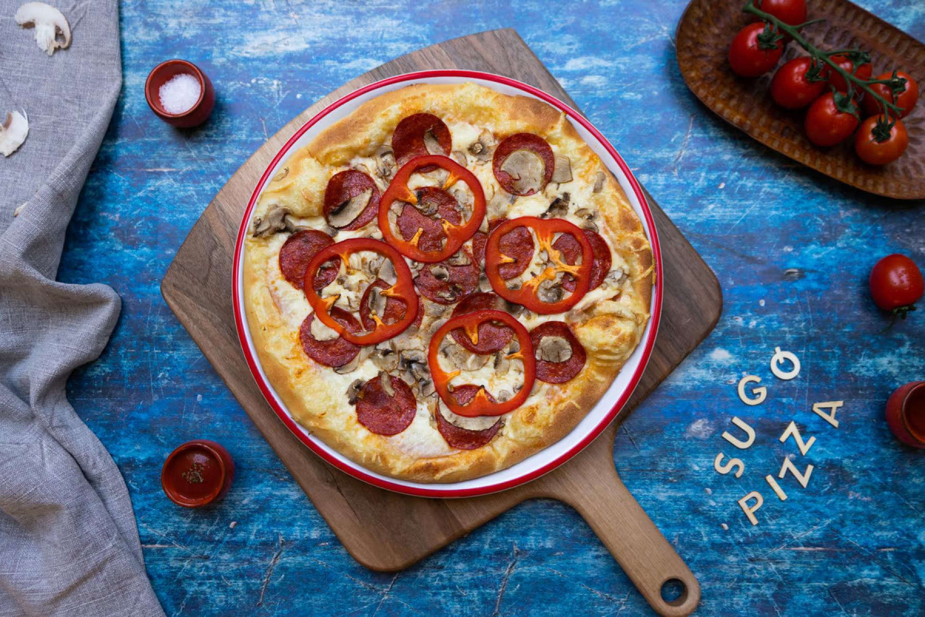 • Kolbászos Paradicsomszósz, sajt, gomba, kolbászGluténTej