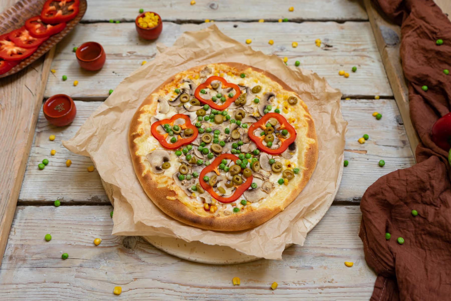 • Vegetariana Paradicsomszósz, sajt, gomba, kukorica, borsó, paprika, olívabogyóGluténTej